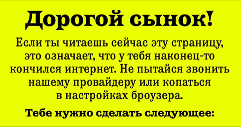 Если ты читаешь сейчас эту страницу, это означает, что у тебя наконец-то кончился интернет. Не пытайся звонить нашему провайдеру или копаться в настройках браузера.