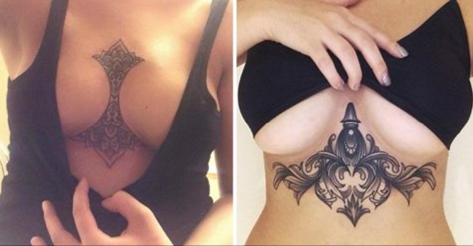 Татуировки под грудью — относительно недавний тренд, который стал безумно популярным в последнее время. Обычно это выглядит так: рисунок начинается от середины грудины, расширяющиеся в области живота и заканчивающиеся у rруди. Прозвучит конечно банально, но для тату под грудью требуется, собственно говоря, сама грудь… женская rрудь.