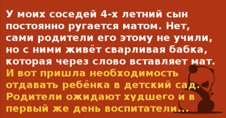 При выходе их садика мама спрашивает, мол, неужели он не матерился, на что тот выдаёт гениальную фразу: