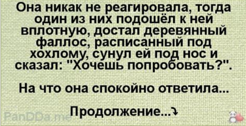 Она никак не реагировала, тогда один из них подошёл к ней вплотную, достал деревянный фаллос, расписанный под хохлому, сунул ей под нос и сказал: «Хочешь попробовать?».