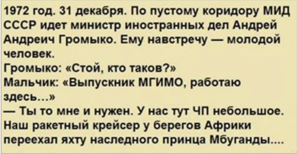 — Ты то мне и нужен. У нас тут ЧП небольшое. Наш ракетный крейсер у берегов Африки переехал яхту наследного принца Мбуганды. Есть погибшие. Мировая общественность возмущена. Нужно срочно подготовить сообщение ТАСС, а все сотрудники уже по домам расползлись, суки. Так что, даю тебе час на подготовку сообщения.