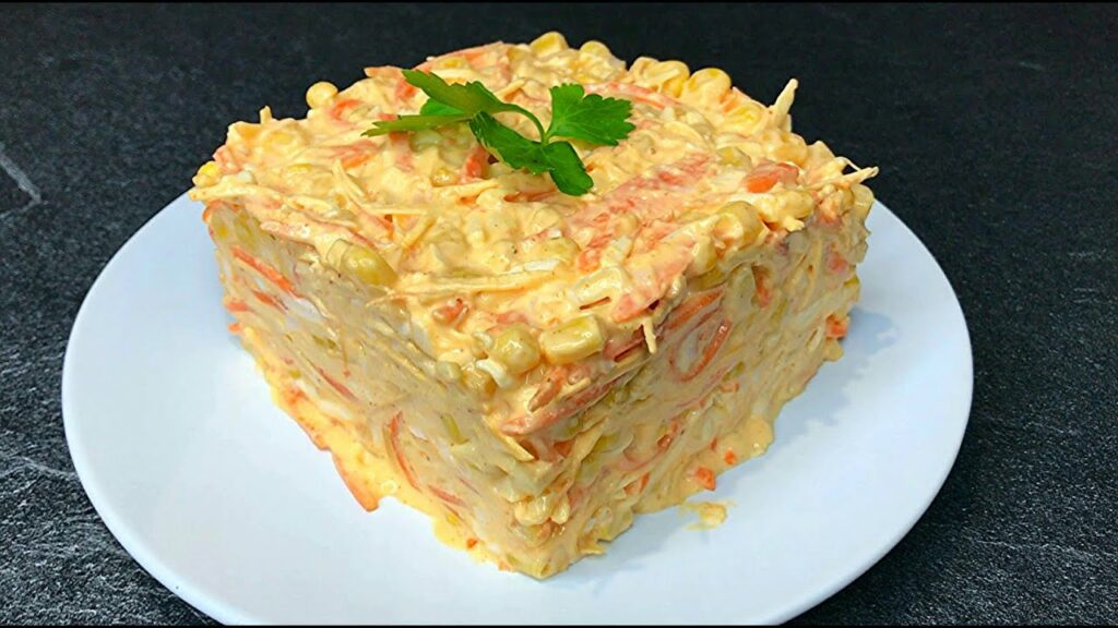 Добавляем к ним кукурузу и майонез. Перемешиваем и все готово. Кстати, для красивой подачи салата на стол, можно использовать сервировочные кольца или разъемные формы.