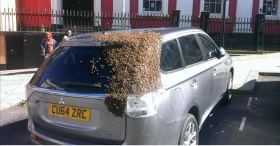 Кэрол Ховарт из Великобритании, припарковав машину, отправилась за покупками. Вернувшись на парковку, она будто очутилась в фильме фэнтези: багажник ее автомобиля облепил пчелиный рой! Том Мосес наблюдал за произошедшим: «Незабываемое зрелище! Я проезжал мимо и вдруг увидел большую коричневую кляксу на машине, — рассказывал мужчина. — Люди останавливались просто ради того, чтобы сфотографировать это!» «Я боялся одного, — продолжал очевидец. — Машина стояла напротив бара, и какой-нибудь пьяница мог выйти, бросить что-нибудь в пчел, а потом оказаться в больнице». Недолго думая, Том вызвал группу пчеловодов, которым быстро удалось заманить насекомых в коробку. Но пчелиный клан отказывался сдаваться: