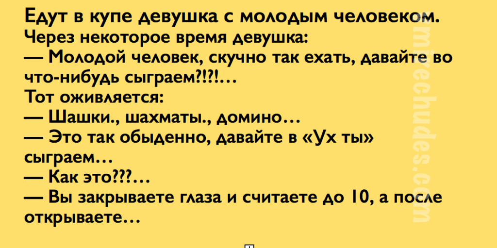 — Молодой человек, скучно так ехать, давайте во что-нибудь сыграем?!?!…