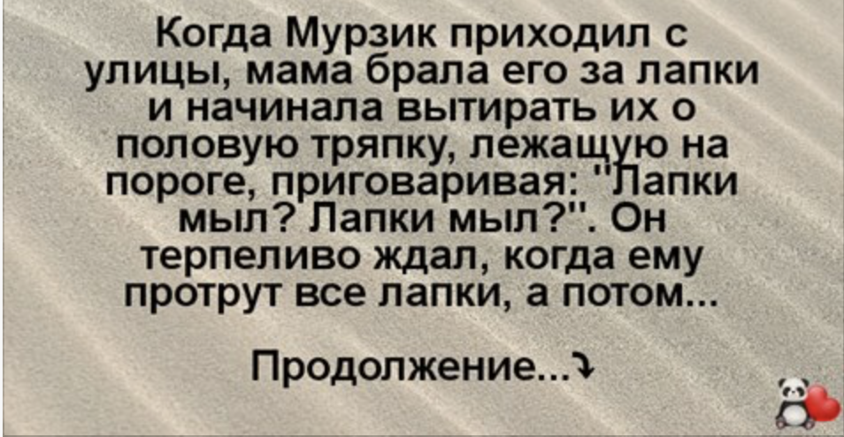 Когда Мурзик приходил с улицы, мама брала его за лапки и начинала вытирать их о половую тряпку, лежащую на пороге, приговаривая: «Лапки мыл? Лапки мыл?». Он терпеливо ждал, когда ему протрут все лапки, а потом шел на кухню и дочиста вылизывал их.