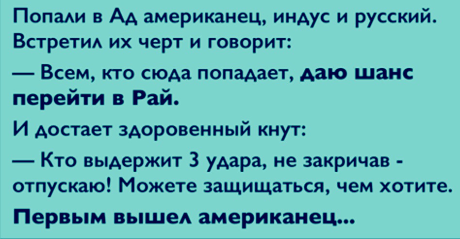 Их встречает бес и говорит: «У вас есть уникальный шанс попасть в рай», — после чего достает огромный кнут. – Но при одном условии: вам нужно выдержать всего лишь 3 удара, не издав при этом ни звука. Получится – вы свободны. Вы в праве защищать себя чем угодно».