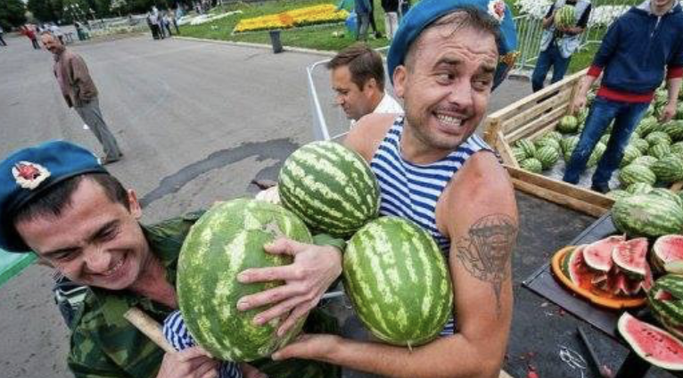 А дальше был полный …. разгром. Кавказец рубашку на себе дёрнул, а под ней тельняшка и татуировка — парашют и ВДВ в орнаменте. И на ребят прямо через прилавок полез — здоровый такой, страшный и злой вэдэвэшник. Да ещё и со здоровенным ножом, которым арбузы режут. Они все по-скорому и разбежались, а Юрец на корке подскользнулся и прямо на разбитый арбуз и сел (ещё и форму стирать блин! чтобы отец-то не заметил и не выпорол!)