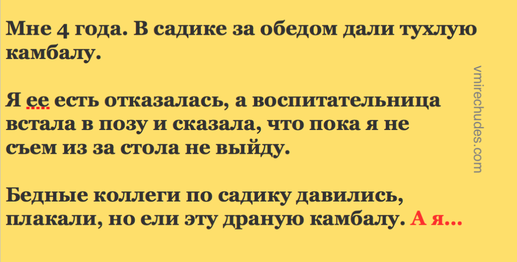 Вечером пришла за мной мама, всем выписала «на орехи» за издевательство над ребенком и увела домой. А утром… утром выяснилось, что наша группа закрыта на карантин т.к все отравились, часть в больнице, часть дома, но в не транспортабельном состоянии. А я целую неделю отдыхала у бабушки на даче, загорала, купалась и очень четко осознавала: взрослые далеко не всегда правы. И надо уметь отстаивать свою точку зрения не смотря ни на что.