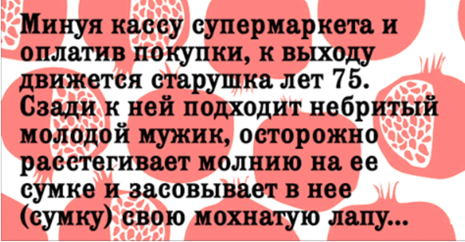 Минуя кассу супермаркета и оплатив покупки, к выходу движется старушка лет 75. Сзади к ней подходит небритый молодой мужик, осторожно расстегивает молнию на ее сумке и засовывает в нее (сумку) свою мохнатую лапу, потом руки в карманы и обгоняя старушку к выходу…