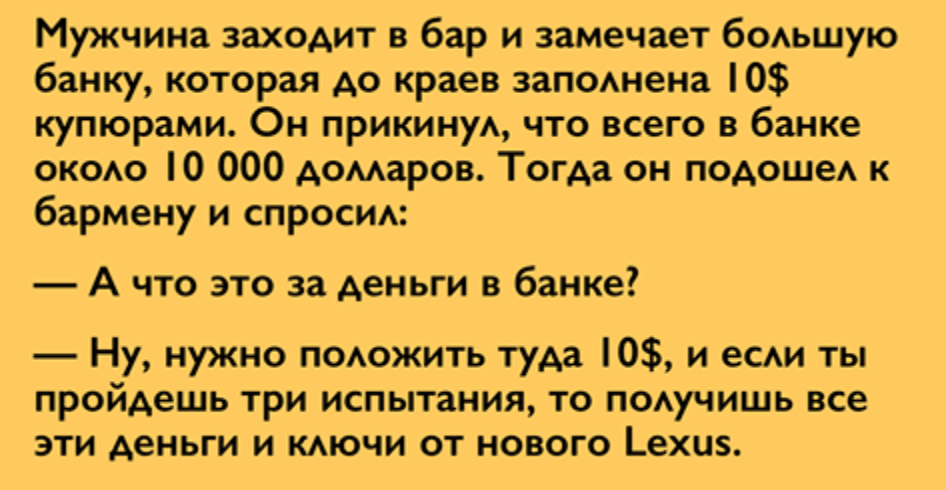 Мужчина заходит в бар и замечает большую банку, которая до краев заполнена 10$ купюрами. Он прикинул, что всего в банке около 10 000 долларов. Тогда он подошел к бармену и спросил: