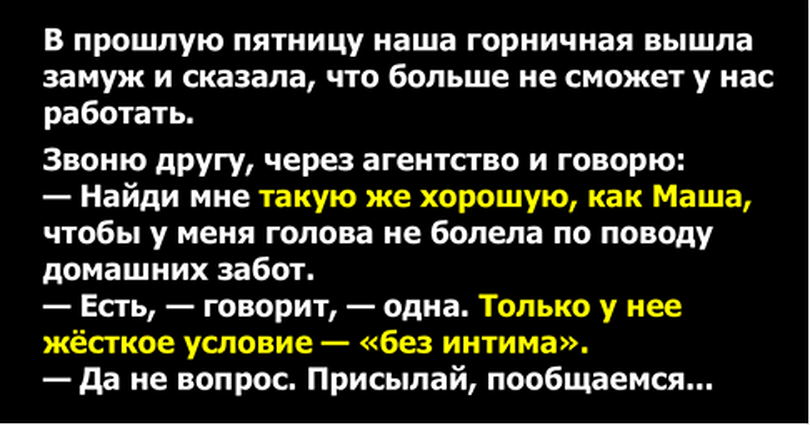 В прошлую пятницу наша горничная вышла замуж и сказала, что больше не сможет у нас работать. Через неделю я понял, что так жить нельзя и надо искать новую.