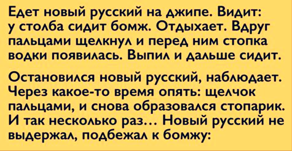 Бомж посмотрел, достал из-за пазухи лампу, отдал новому русскому и уехал на джипе… Новый русский потер лампу. Оттуда со свистом вылетел джинн: