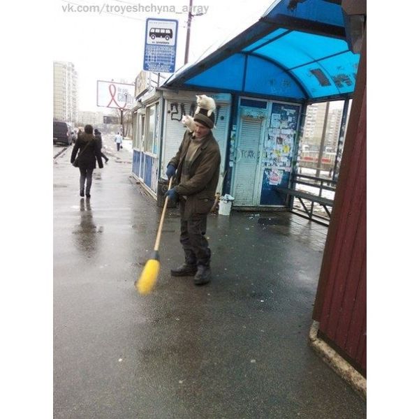 Сеть «взорвали» смешные и забавные фото мужчины, который подметает улицы с двумя котами...