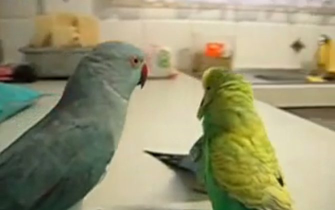 Три забавных попугайчика устроили веселую беседу. Они ходят по столу и что-то активно...
