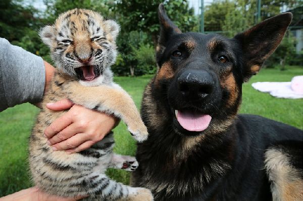 У тигренка, от которого в двухнедельном возрасте отказалась мама, теперь несколько приемных родителей...