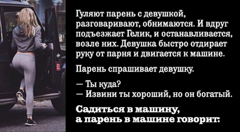 История — урок… Гуляют парень с девушкой, разговаривают, обнимаются. И вдруг подъезжает Гелик, и останавливается, возле них. Девушка быстро отдирает руку от...