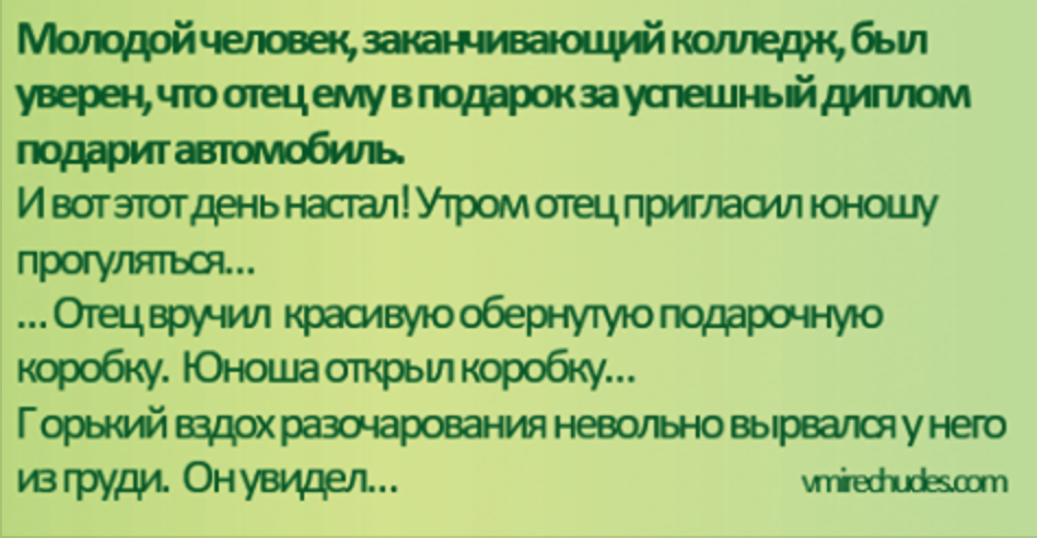 Один молодой человек, заканчивающий колледж, был уверен, что отец ему в подарок за...