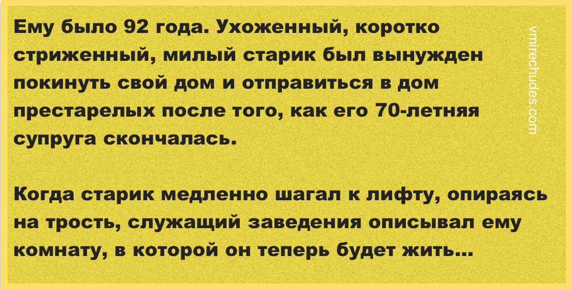 Ему было 92 года. Ухоженный, коротко стриженный, милый старик был вынужден покинуть свой...