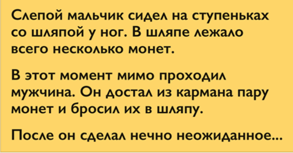 Мальчик держал в руках табличку со словами: «Я слепой, пожалуйста, помогите!» Тут к...