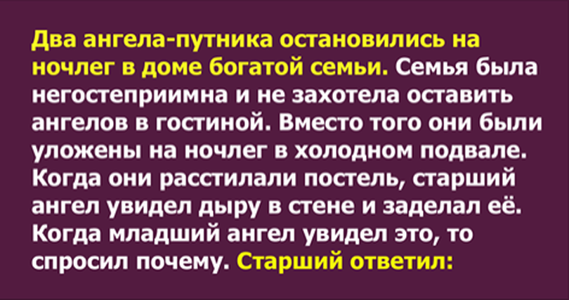 Два ангела-путника остановились на ночлег в доме богатой семьи. Семья была негостеприимна и...