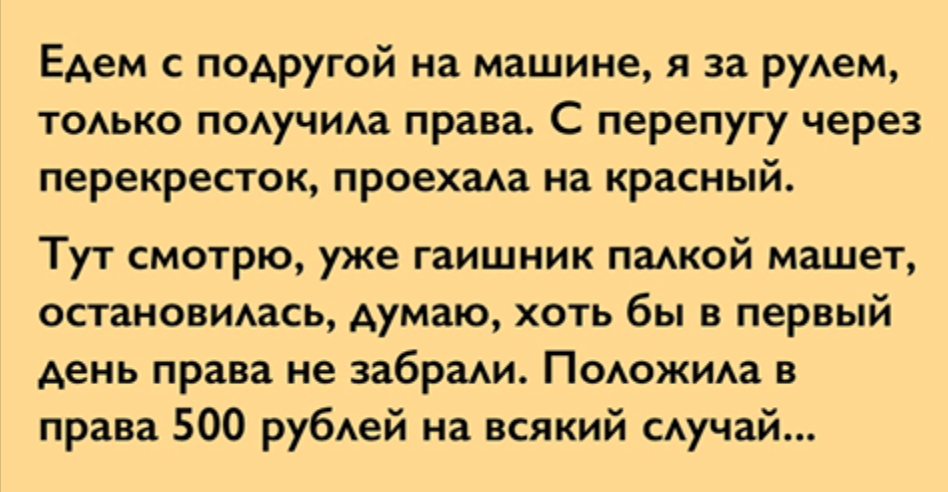 Тут смотрю, уже гаишник палкой машет, остановилась, думаю, хоть бы в первый день права не забрали. Положила в права 500 рублей на всякий случай, чтобы взятку дать, как муж учил. Подходит, представляется, говорит: