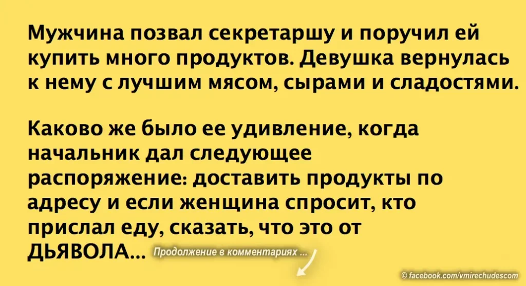 Мужчина узнал ее адрес, позвал секретаршу и поручил ей купить много продуктов. Девушка вернулась к нему с лучшим мясом, сырами и сладостями. Каково же было ее удивление, когда начальник дал следующее распоряжение: доставить продукты по адресу и если женщина спросит, кто прислал еду, сказать, что это от ДЬЯВОЛА.