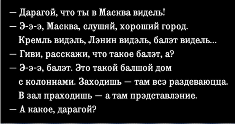 — Э-э-э, балэт. Это такой балшой дом с колоннами. Заходишь- там всэ раздеваюцца. В зал праходишь — а там прэдставлэние.