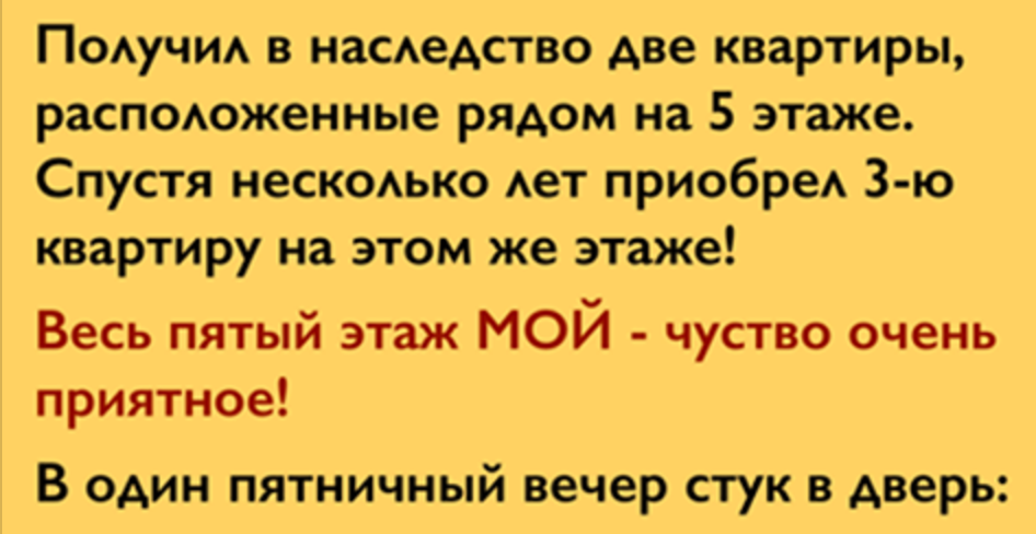 Давненько получив в наследство 2 квартиры расположенные рядом (совмещенные ранее родителями) на пятом этаже, положил глаз на третью, последнюю на лестничной клетке.
