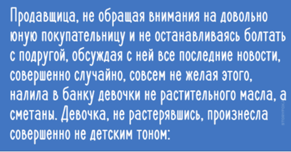 Продавщица, не обращая внимания на довольно юную покупательницу и не останавливаясь болтать с подругой, обсуждая с ней все последние новости, совершенно случайно, совсем не желая этого, налила в банку девочки не растительного масла, а сметаны. Девочка, не растерявшись, произнесла совершенно не детским тоном: