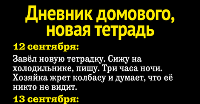 Завёл новую тетрадку. Сижу на холодильнике, пишу. Три часа ночи. Хозяйка жрет колбасу и думает, что её никто не видит.