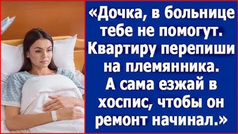 Дочко, лікарі тобі не допоможуть, їдь у хоспіс, а квартиру перепиши на племінника … FA 2 года назад Дочко, лікарі тобі не допоможуть, їдь у хоспіс, а квартиру перепиши на племінника …