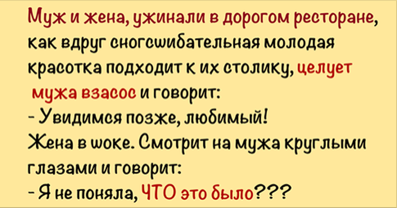 Как вдруг сногсшибательная молодая красотка подходит к их столику, целует мужа взасос и говорит: