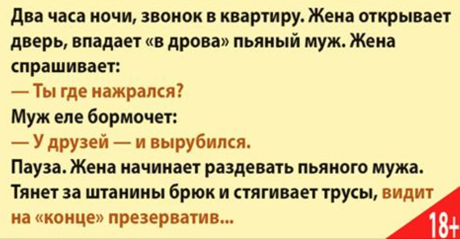 Два часа ночи, звонок в квартиру. Жена открывает дверь, впадает «в дрова» пьяный муж. Жена спрашивает: