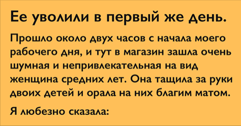 Прошло около двух часов с начала моего рабочего дня, и тут в магазин зашла очень шумная и непривлекательная на вид женщина средних лет. Она тащила за руки двоих детей и орала на них благим матом.