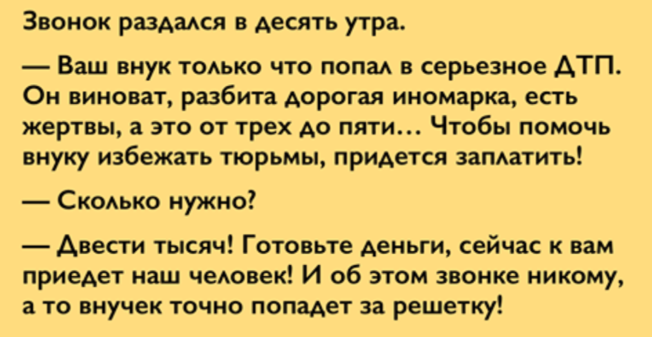 — Двести тысяч! — решительно заявили на том конце провода. — Готовьте деньги, сейчас к вам приедет наш человек! И об этом звонке никому, а то внучек точно попадет за решетку!