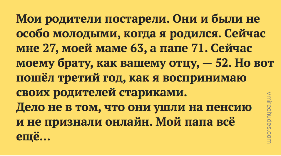 Мои родители постарели. Они и были не особо молодыми, когда я родился. Сейчас мне 27, моей маме 63, а папе 71. Сейчас моему брату, как вашему отцу, — 52. Но вот пошёл третий год, как я воспринимаю своих родителей стариками.