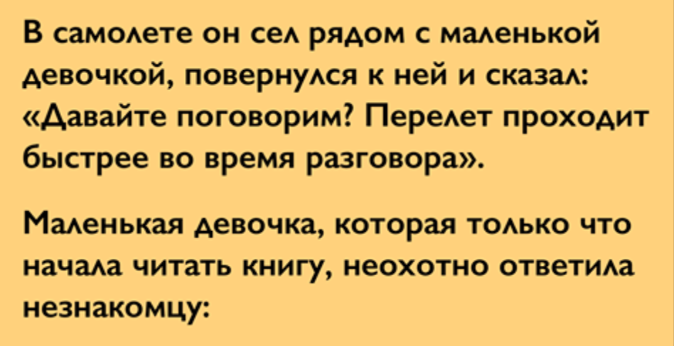 В самолете он сел рядом с маленькой девочкой, повернулся к ней и сказал: «Давайте поговорим? Перелет проходит быстрее во время разговора.»
