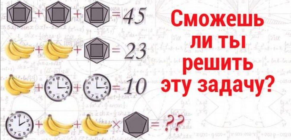 Каждый банан по отдельности равен единице. Каждый угол многоугольника — тоже. И время на часах тоже обозначает нужное число! В конечном итоге всё сводится к уравнению:
