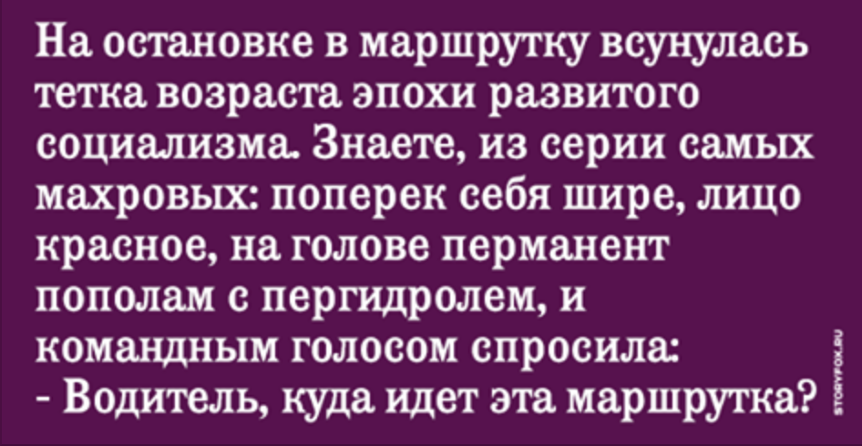 На остановке в маршрутку всунулась тетка возраста эпохи развитого социализма. Знаете, из серии самых махровых: поперек себя шире, лицо красное, на голове перманент пополам с пергидролем, и командным голосом спросила: