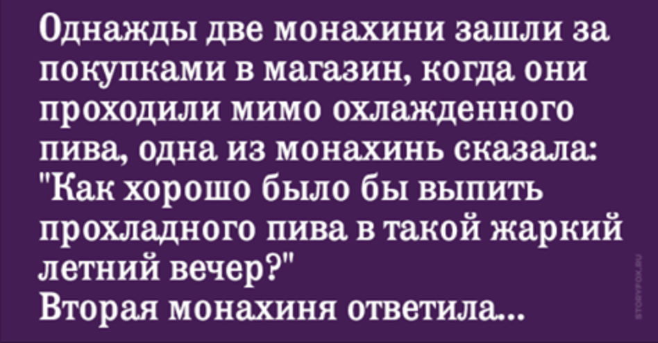 Однажды две монахини зашли за покупками в магазин, когда они проходили мимо охлажденного пива, одна из монахинь сказала: «Как хорошо было бы выпить прохладного пива в такой жаркий летний вечер?»