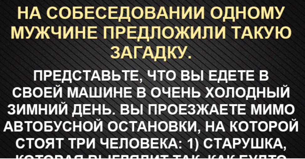 На собеседовании одному мужчине предложили решить такую загадку. Представьте, что вы едете в своей машине в мороз и метель. Вы проезжаете мимо автобусной остановки, на которой стоят три человека: