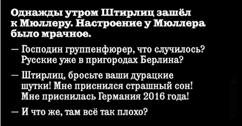 — Штирлиц, бросьте ваши дурацкие шутки! Мне приснился страшный сон! Мне приснилась Германия 2016 года!