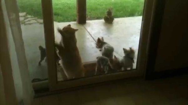 Этот рыжий кот поступил как настоящий взрослый – взял ситуацию под свой контроль и, повиснув на дверной ручке, открыл дверь, чтобы впустить в дом нагулявшихся щенков, робко столпившихся перед входной дверью.