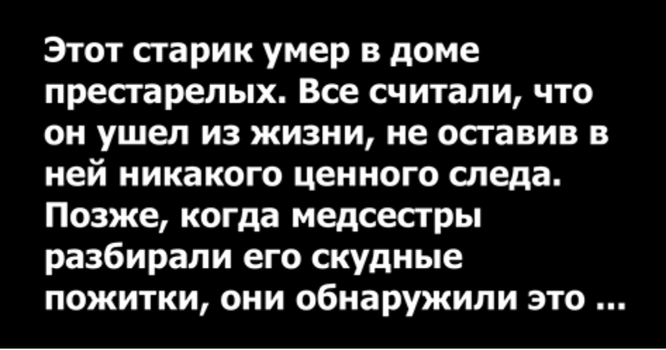 Этот старик умер в доме престарелых. Все считали, что он ушел из жизни, не оставив в ней никакого ценного следа. Позже, когда медсестры разбирали его скудные пожитки, они обнаружили это стихотворение.