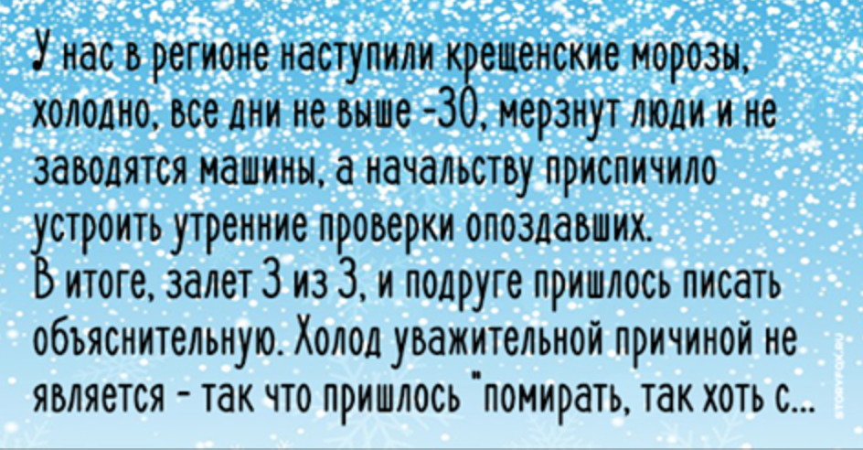 У нас в регионе наступили крещенские морозы, холодно, все дни не ниже -30, мерзнут люди и не заводятся машины, а начальству приспичило устроить утренние проверки опоздавших.