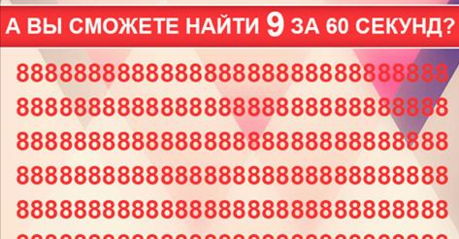 Головоломка, которую сможет решить лишь 1 человек из 80. А у вас получится? В мире Чудес 8 лет назад По статистике, найти на этих картинках цифру 9 за 60 секунд под силу только 1 человеку из 80! А у вас получится? Давайте же проверим вашу внимательность!