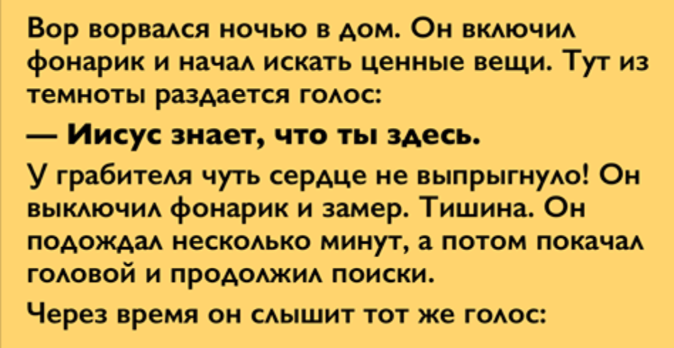 Вор ворвался ночью в дом. Он включил фонарик и начал искать ценные вещи. Тут из темноты раздается голос: