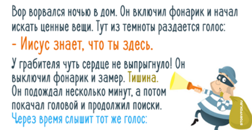 У грабителя чуть сердце не выпрыгнуло! Он выключил фонарик и замер. Тишина. Он подождал несколько минут, а потом покачал головой и продолжил поиски.