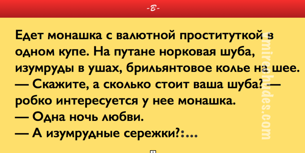 Едет монашка с валютной проsтитуткой в одном купе. На путане норковая шуба, изумруды в ушах, брильянтовое колье на шее.