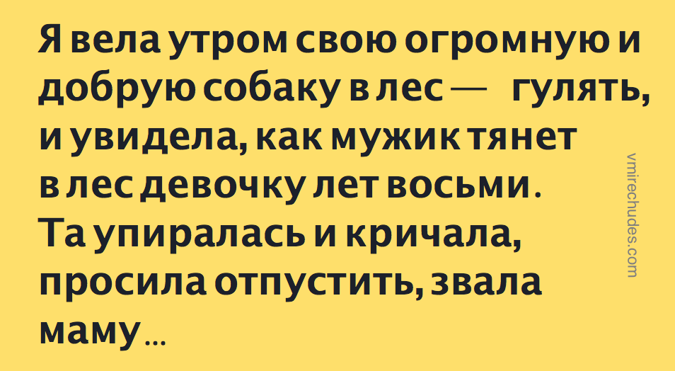 Я вела утром свою огромную и добрую собаку в лес — гулять, и увидела, как мужик тянет в лес девочку лет восьми. Та упиралась и кричала, просила отпустить, звала маму.
